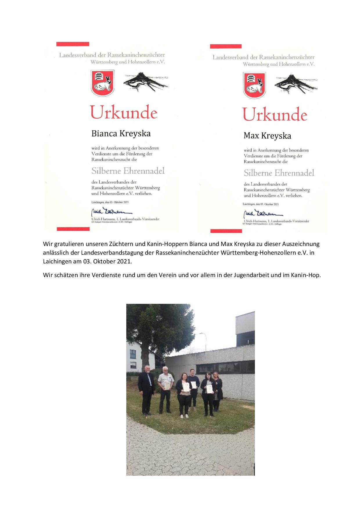 Grund seines Engagement in der Vereinsarbeit, wurde Er vom Landesverband der Rasse - Kanichenzüchter Württemberg für seine Arbeit im Ehrenamt, mit der Goldenen Ehrennadel ausgezeichnet, die Er redlich verdient hat.